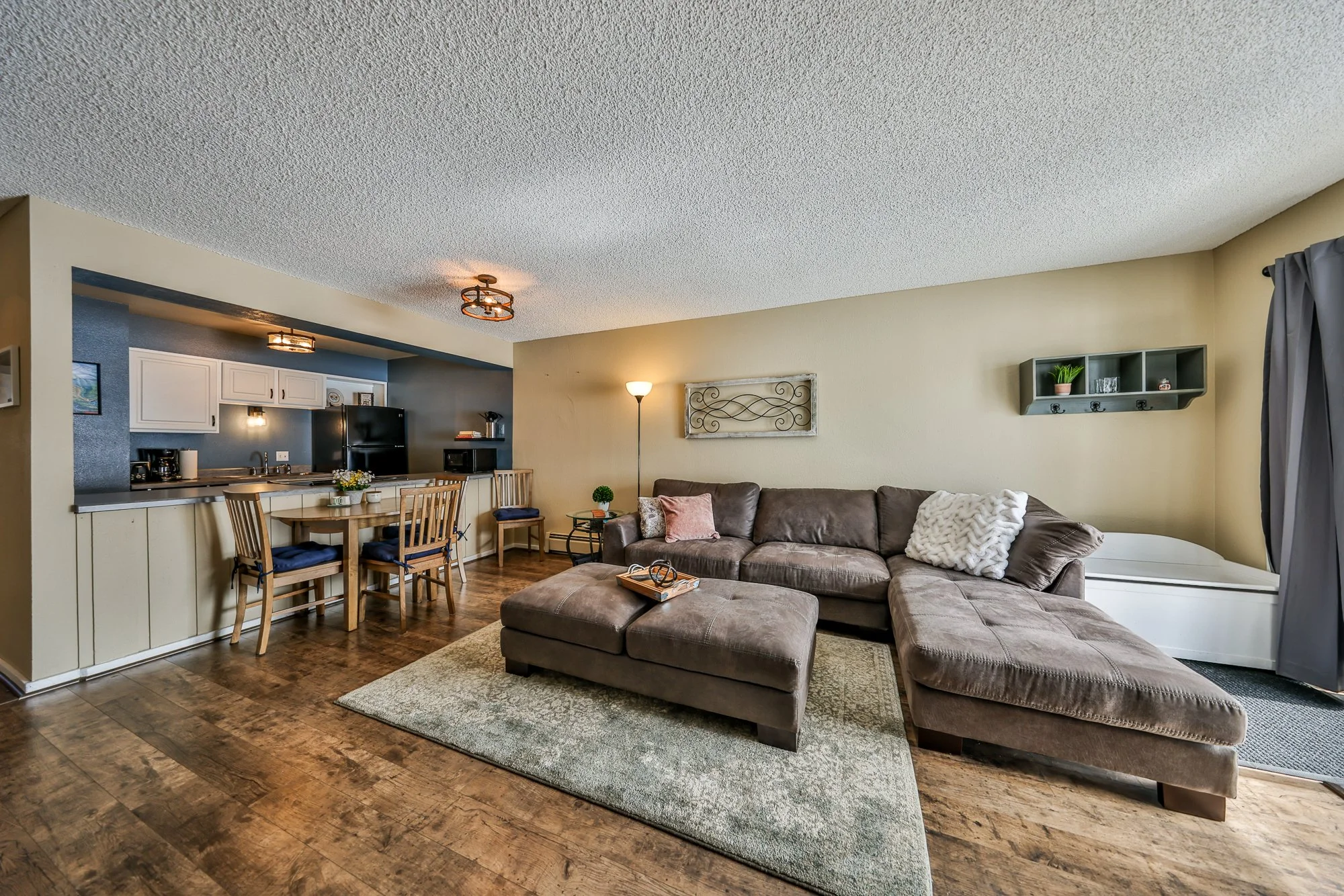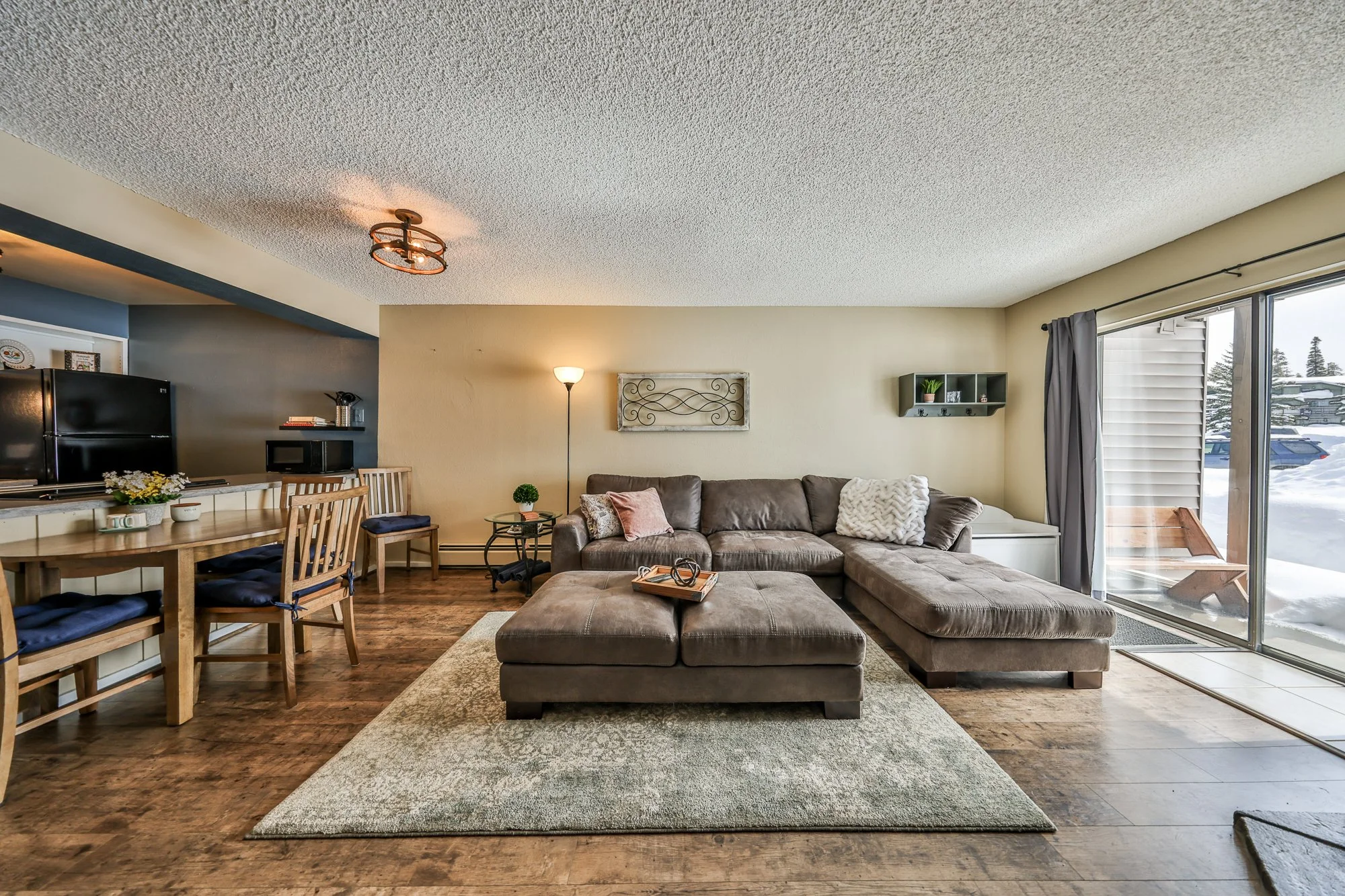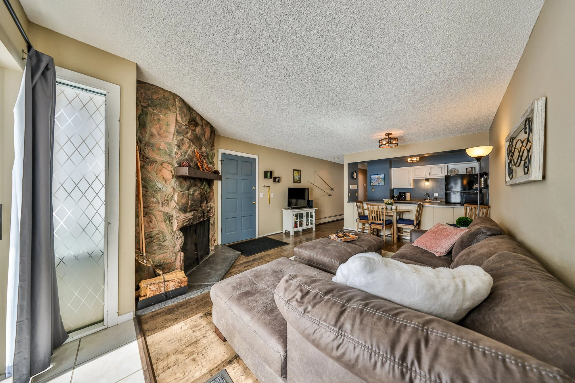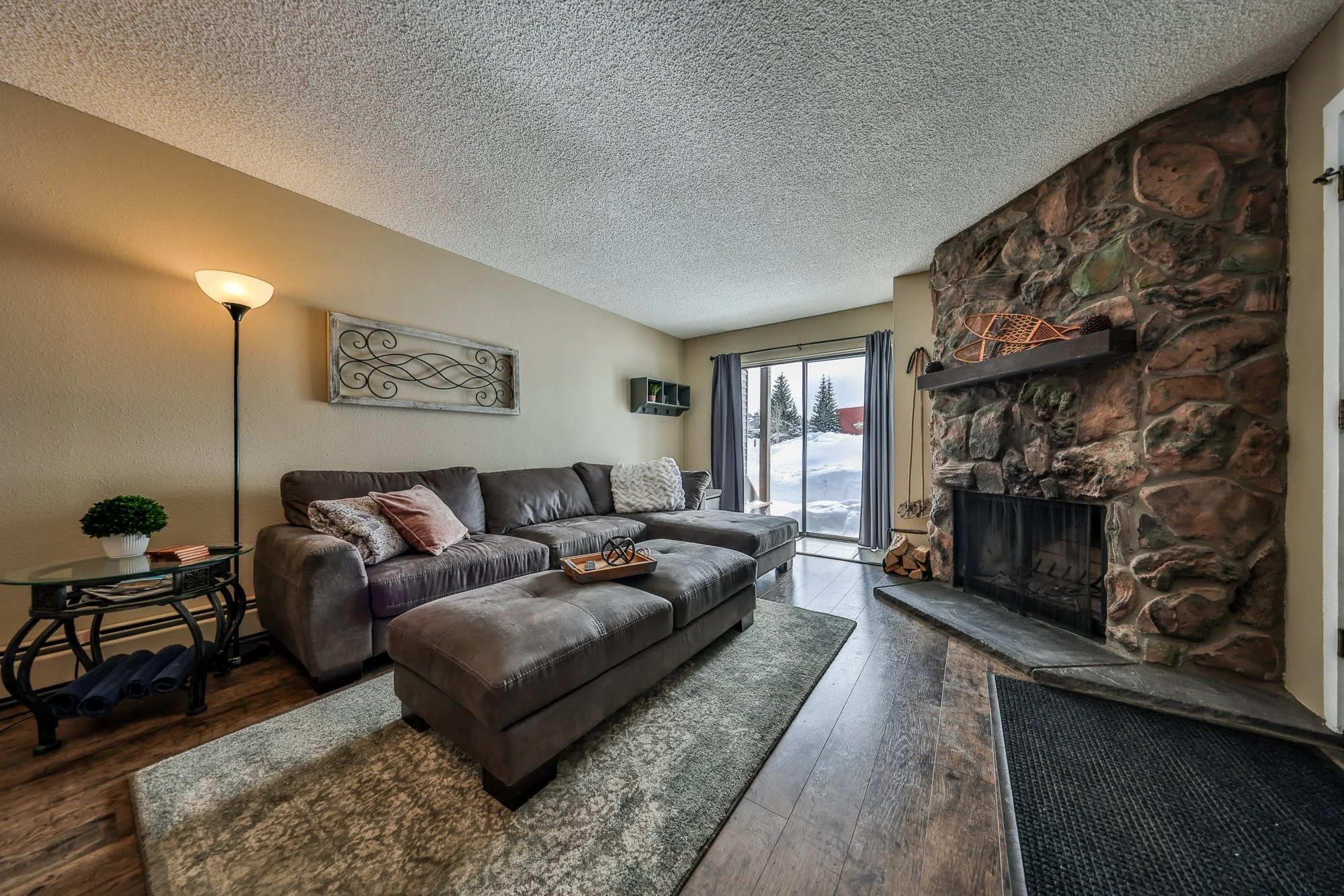Cozy up by the wood-burning fireplace with its classic rock surround, or step out onto your private patio with scenic mountain views. Inside, you’ll find an updated kitchen and bath, engineered plank flooring, and a spacious open-concept living area. The comfy sectional invites relaxation, while the dining area and open kitchen make entertaining a breeze. Your mountain getaway awaits, come see for yourself!